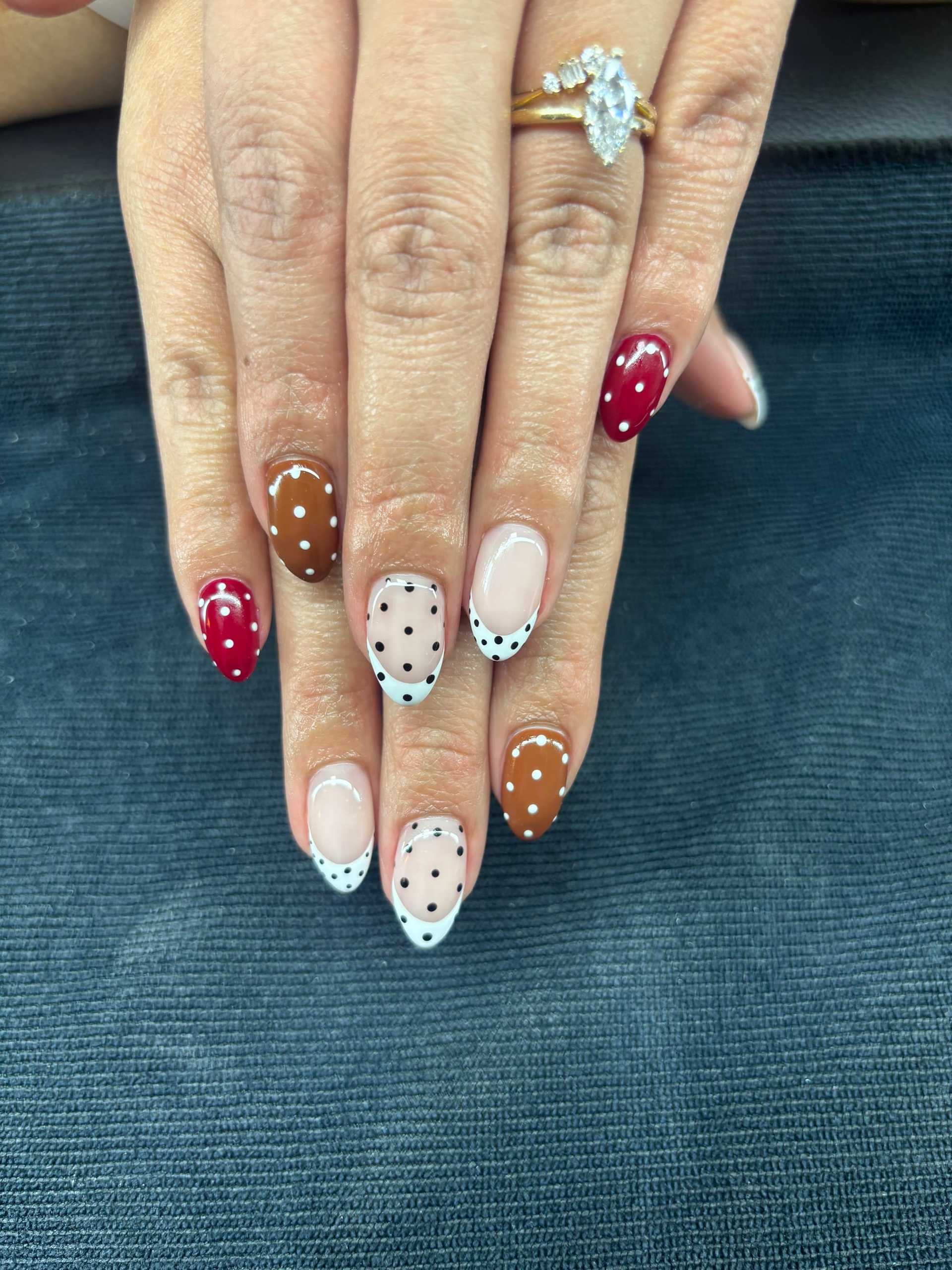 Polka dots are popping up in autumnal palettes—think brown-on-neutral or seasonally toned French tips. Versatile and playful, this retro-inspired motif continues to evolve across nail lengths and shapes. (Who What Wear)